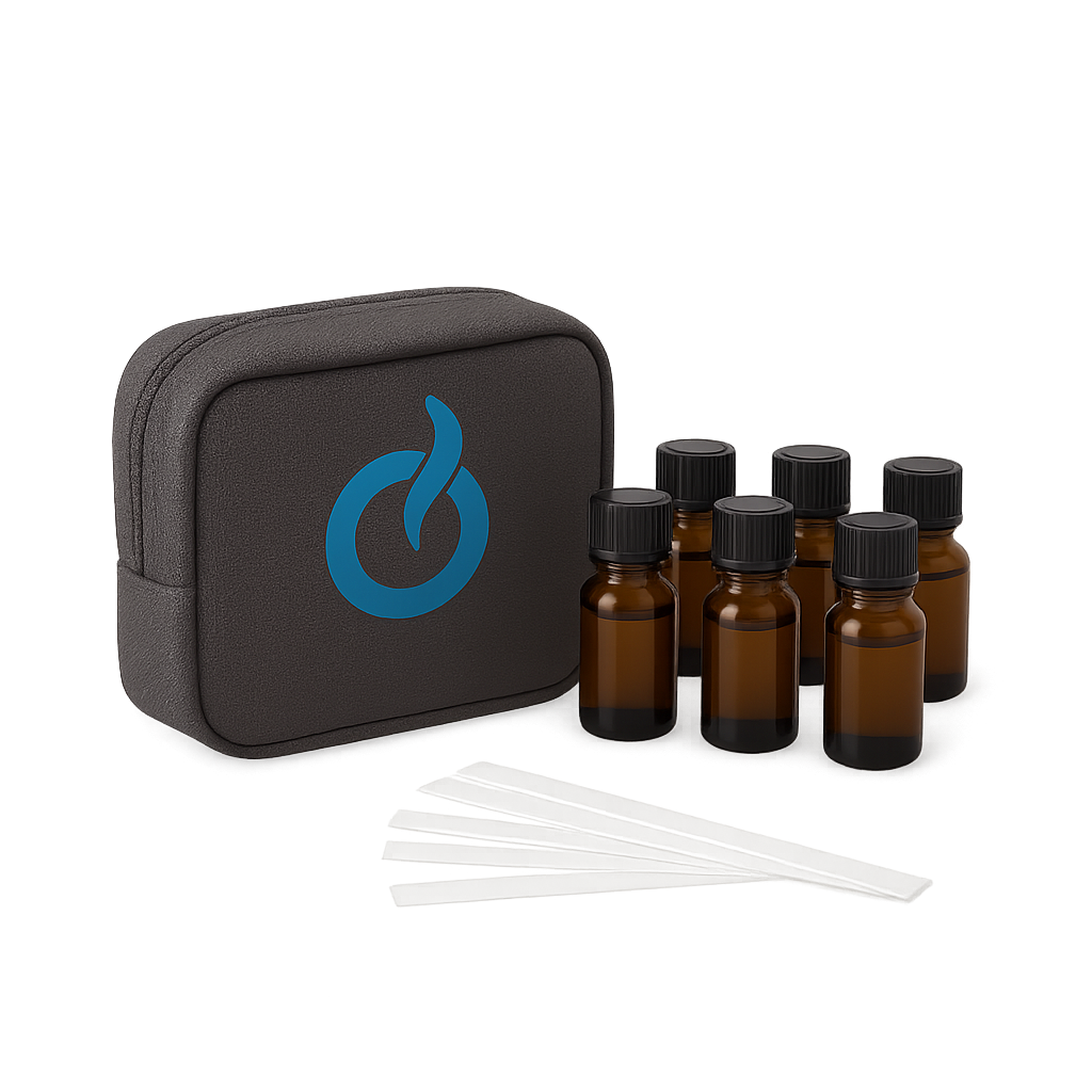 Kit d’entraînement olfactif comprenant une trousse, une sélection d’huiles essentielles et des touches à sentir, accompagné de l’application mobile de suivi et de guidage.